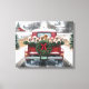 En gammal röd lastbil som dekorerats med en festiv krans bär med sig en grupp lekfulla valpar från Golden Retriever genom snöslandskapet med snötäcke.
