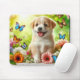 I en levande trädgård fylld med färgfulla blommor sitter en glad valp i mitten och utstrålar ren glädje. Hans lysande ögon gnistra med glädje när han flydde ett hjärtskärande leende.