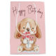 Vattenfärgad valp med rosa blomma på rosa med Grattis på födelsedagen-text. Bakgrunden till färg kan ändras. Text kan redigeras.