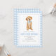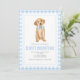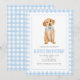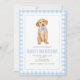 Preppy puppy golden hämmande födelsedag med blå båge och blå plaid.