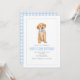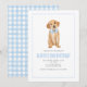 Preppy puppy golden hämmande födelsedag med blå båge och blå plaid.