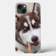 Puppibrun och vit siberian husky med blå öga-ätsticka av trä på stranden.