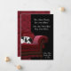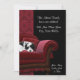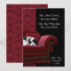 Röd damast sammetssoffa med svart-vit valp adressändrings meddelande.
