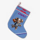 Julen Stocking in Blue med Puppy som springer med en fotboll och personlig namn av barn eller husdjur.