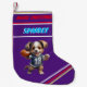 Jul Stocking in Lila with Puppy running with a Fotboll and personlig namn of child or pet.