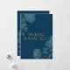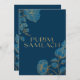 Ett blått kort med blommor till Purim presenting som säger Purim Sameach..