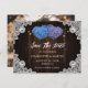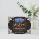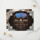 Purple and blue wedding photo save the date card featuring two floral hearts and white floral lace against the barn wood background. A single photo at the back.