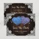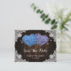 Romantic rustic purple and blue floral wedding save the date card featuring hydrangea flowers against a barn wood background adorned with white floral lace and twinkle lights.