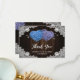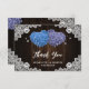 Thank your guest for sharing in your special day with this romantic purple and blue floral wedding thank you card featuring floral hearts on a barn wood background decorated with white floral lace and twinkle lights.
