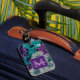 Bright and bold photographic art of blue and purple flowers on personalized luggage tag.