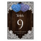 Rustic purple and blue floral wedding table number featuring two floral hearts against a rustic wood background adorned with white floral lace.