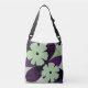 This modern tote bag features a bold yet calm floral design in soft green and deep purple tones.