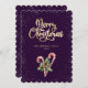 Purple calligraphy Christmas card featuring snowflakes, Christmas candy canes, holly and red berries on a dark purple background.