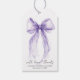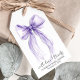 Chic gift tags for your bridal shower party favors featuring an elegant watercolor of a purple coquette bow, "with love and thanks" in a modern script, and the name of the bride and the shower date in simple lettering.
