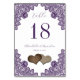 Elegant rustic purple wedding table number card featuring delicate floral lace and two burlap hearts. Matching items available.