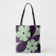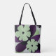 This modern tote bag features a bold yet calm floral design in soft green and deep purple tones.