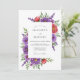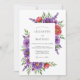 This romantic design features a vibrant arrangement of purple and red watercolor roses. Sprigs of lavender and lush green foliage create a fresh botanical feel against a clean white backdrop. The color palette combines deep violet, soft lavender, and rich crimson for a sophisticated spring or summer look.