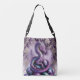 A fantasy digital art piece of a majestic purple and blue dragon curled around a stack of glowing purple and turquoise stones. The dragon has iridescent scales with a gradient from deep purple to bright blue, detailed with intricate patterns and spikes along its back. Its body is coiled in a graceful S-shape, resting on and wrapping around several large, smooth stones of varying sizes. The stones emit a soft purple glow and are partially submerged in a reflective purple-tinted water at the bottom of the image. The background features an ornate damask pattern in light beige against a deep purple backdrop, creating an elegant Victorian atmosphere. The dragon's head is raised in a regal pose, with pointed ears, a long snout, and glowing yellow eyes. Its tail curls around the stones in a decorative manner. The overall composition has a mystical, ethereal quality with a purple and blue color scheme that creates a cohesive, fantasy-like atmosphere.
