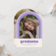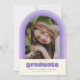 This fun retro inspired graduation announcement features space for a single photo on the front framed by an arch in shades of light purple. It also has space for the graduate's name, school, and class year. The back of the announcement has space for a second photo and more text.