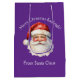 Customize this pretty purple from Santa Claus blue gift bag with your own personalized text with your little girl's name in white script. This beautiful old fashioned drawing of Santa's red hat and white beard are the perfect holiday present bags for your children's presents under the tree on Christmas day.