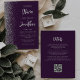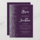 The left-hand edge of this elegant modern wedding invitation features a silver faux glitter border. The customizable text combines pale silver gray script and sans serif fonts on a dark purple background. The reverse side provides space for wedding details on a purple background, along with a QR code guests can scan to visit your website and RSVP, which saves the cost of printing and mailing separate RSVP cards.