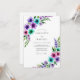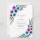 This design features a vibrant array of hand-painted watercolor florals in shades of purple, teal, and magenta. Delicate anemones and sprigs of lavender create a whimsical floral arrangement. The lush greenery adds a fresh, organic feel to the composition. Perfect for a breezy seasonal event, this botanical artwork evokes a sense of romance and modern elegance.