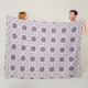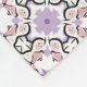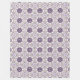 "Image showing a bathroom towel and washcloth set, both featuring a geometric pattern with purple, white, and gray colors, hung and folded neatly."