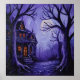 This whimsigoth poster features a gothic-style house with glowing windows is surrounded by eerie, leafless trees under a moonlit sky. The scene is painted in shades of purple and evokes a mysterious, haunting atmosphere. Finished as an oil acrylic paint art print.