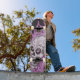 Den roliga skallen som omges av lilor, flammar är en färgrik skalle som ser underbar på skateboards.