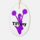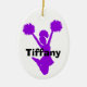 Purpurfärgad silhouette av en banhoppninghejaklacksledare mot en oval keramisk prydnad för vit. Svarten sätta en klocka på beställnings- text läser hejaklacksledare, på baksidaen och namn, på bekläda. Personifiera alla text för din speciella andeledare. Gör en underbar gåvaidé.
