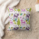 En kudde som presenterar ett themed mönster för skogsmark med illustrationer av purpurfärgad hjort, ekollonar, blommor, vintergröna träd och löv.