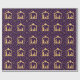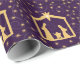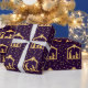 En silhouette av den heliga familjen med stall, Joseph och Mary tittar över bebiset Jesus i mangeren. Guld- stjärnor och virvlar runt surround platsen. Bakgrunden är en majestätisk regal lilafärg. Klicka på skräddarsy som den knäppas att personifiera med text.