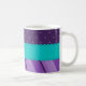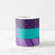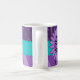 Den moderna kaffemuggen med en purpurfärgad blomma, litet hålband för turkos på en purpurfärgad polka pricker och river av bakgrund. Skräddarsy den, genom att tillfoga text, om du önskar.