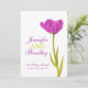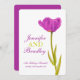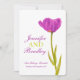 Purpurfärgad tulpan för härlig singel på inbjudningar för ett bröllop för vattenfärg för vitpapper blom-. Redigera detta inbjudningar med din egna ord, och bröllop specificerar. Enkel romantisk inbjudan för konst för landstilvår. Design- och vattenfärgmålning av Sarah Trett www.sarahtrett.com för www.mylittleeden.com