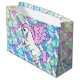 Den gulliga vitunicornen med rosa hår och vingar med ett mönster av Unicornbakgrund i lutning slösar. Fullständigt anpassade. Den stora unicornen kan flyttat omkring och resizeds.