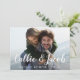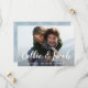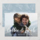 Ett elegant bröllop sparar det designade datumvykortet för att passa ditt favoritfoto för vågrät eller fullt-utfallsorienterad förlovning. Namnen visas som en vit textövertäckning i moderna handskrivna kalligrafiskript för pensel. Anpassa med ditt bröllop-datum och bröllop-läge under. Kort som går tillbaka till ett litet botaniskt mönster i mjukt blått med utrymme för att inkludera webbplatsens URL för bröllop eller ytterligare information som du väljer. Du kan ändra färg genom att klicka på Anpassa/Anpassa och sedan välja ny bakgrund färg antingen från paletten eller genom att ange en färg hex-kod.