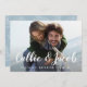 Ett elegant bröllop sparar det designade datumvykortet för att passa ditt favoritfoto för vågrät eller fullt-utfallsorienterad förlovning. Namnen visas som en vit textövertäckning i moderna handskrivna kalligrafiskript för pensel. Anpassa med ditt bröllop-datum och bröllop-läge under. Kort som går tillbaka till ett litet botaniskt mönster i mjukt blått med utrymme för att inkludera webbplatsens URL för bröllop eller ytterligare information som du väljer. Du kan ändra färg genom att klicka på Anpassa/Anpassa och sedan välja ny bakgrund färg antingen från paletten eller genom att ange en färg hex-kod.