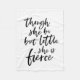 Snyggt litterär filt med svart penselskript av citatet "Även om hon är liten är hon hård" från A Midsommar Nattes Dream av William Shakespeare mot en vit bakgrund. *Observera att Zazzle Watermark som visas i zoomförhandsvisningen INTE visas på den färdiga tryckta produkten. © Rosewood and Citrus