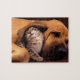 Spelpussel som visas med ett fototryck av en söt kattunge och hund som engångsplagg. Anpassa det här objektet eller köp som det är. Lagrar-bild