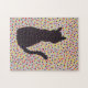 Svart katt (eller en silhuett kattdjur av valfritt färgad). Sprickade prickar i rött, gult och svart på gråttets bakgrund. Art av Deanna Pendrick