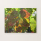 Druvorna löv blir röda på vinet. I bakgrunden ligger löv av grönt och druvor för lila under. Solglöd genom löven som kastar skuggor på subjekt löv.