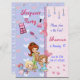 Festlig fin hjärtmönster på ljusblå/lavendel. Det finns söta flickaktiga detaljer med tryckta rosa slingor och spetsar. Tre små flickor visas iförda pyjamas och redo för fest. Anpassa texten på framsidan och baksidan av denna söta inbjudan till pyjamasparty. Namn, födelseår och all information är redo att ändras av dig.