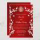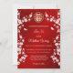 Dusty rosa cherry blommar grenar, två fjärilar och en lyckosymbol för dubbla i guld på röd bakgrund. Med en skannerbar QR-kod på baksidan.