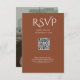 A modern and minimalistic deep copper wedding RSVP card designed with clean typography, a functional QR code for easy digital responses, and a fully customizable photo background on the reverse side. This elegant two-sided design blends convenience with a personal touch, making it perfect for couples who want a contemporary and stylish wedding stationery experience. Less hassle, no missing mail when you invite your guests to RSVP online with your QR code that sends them directly to your wedding website.