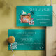 Vintage-reflektor-stil-bagage, fotokamera, segelflyg-frakt och helgdagar i handflatan träd på en vatten liknande blå tealbakgrund skapar ett färglöst resebyråsaffärskort med din automatiska skanning QR CODE till webbplats eller katalog.