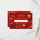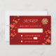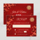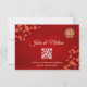 Röda körsbärssymboler på en strålande röd bakgrund och en lyckosymbol för guld dubbla. OSA Kinesiskt Bröllop-kort. På baksidan finns en skannerbar fyrkantig kod för webbplatsen bröllop.