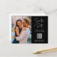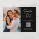 De här enkla och elegant svarta vykorten i bröllop spara datum har modern handskriven skripttypografi tillsammans med ditt favoritfoto och en QR-kod som leder till webbplatsen i bröllop.