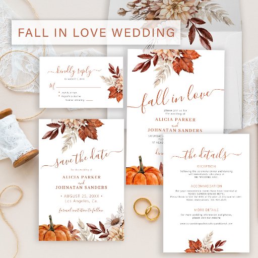 Moderna botaniska blommor, pumpa, lövning och torkat löv skapar en höstbudget i chic i en bröllopsinbjudan med ett kalligrafiskt manus för trendiget handskrift och en jordisk terracotta beige färg palett. ++++++++++++++++ Anpassa den med din bild- och QR-kod till webbplatsen eller till OSANS online.