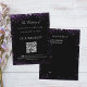 En svart bakgrund dekorerad med lila faux glitter-gnistor. På framsidan, namn, bröllop-datum, QR-kod, skannertext. Tillbaka: lägg till önskelistan.