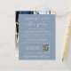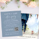 Budgetvänlig dammig blått elopement eller privat tillkännagivande av bröllop och bröllopsmottagning eller inbjudan till firande-parti. Framsidan har "Lyckligtvis allt efter Party" i enkel vit typografi och ett vitt skript med elegant med dekortecken, och du kan anpassa ditt meddelande och din inbjudan, skapa en QR-kod som är länkad till din bröllop webbplats så att dina gäster kan söka efter mer information och OSA online och lägga till namn i ett namnteckning skript. Den omvända sidan har ditt favoritfoto från bröllop, ditt första datum för namn och bröllop.